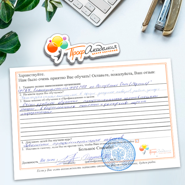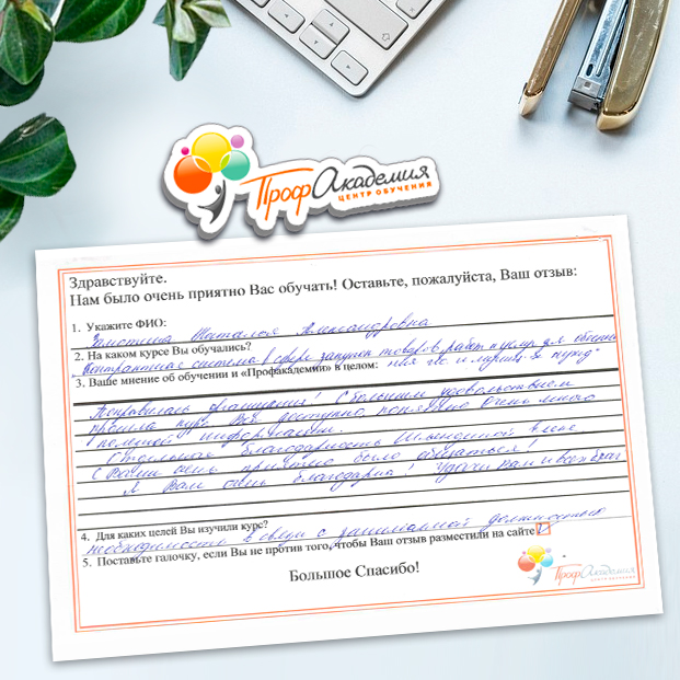 Огромное спасибо за отличный учебный материал и за учебный процесс. Обучаемся не в первый раз и остаемся по максимуму довольны всем. "Профакадемия" хорошая, самое главное, что учиться можно в удобное для себя время, не прерывая свою трудовую деятельность. Надеемся на дальнейшее сотрудничество.